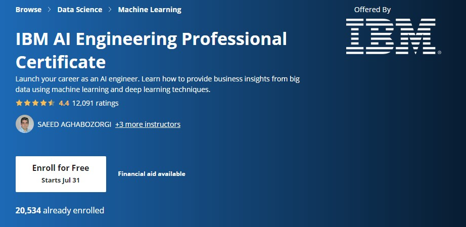This is another popular certificate course in Artificial Intelligence designed by a panel of top IBM experts in the field. It is suitable for professionals such as AI developers and data scientists who want to level up.